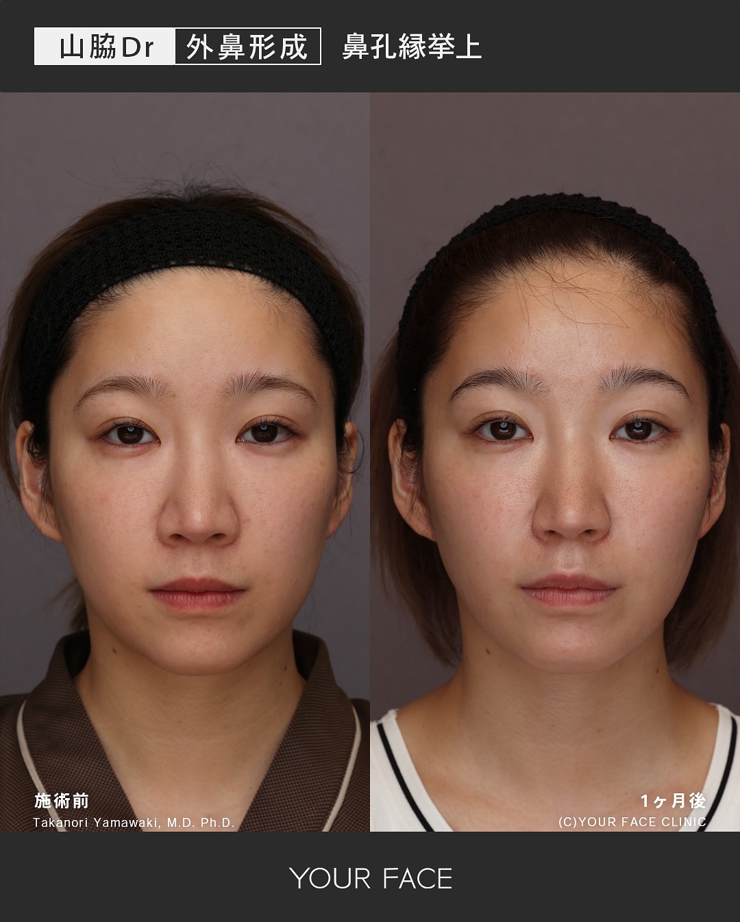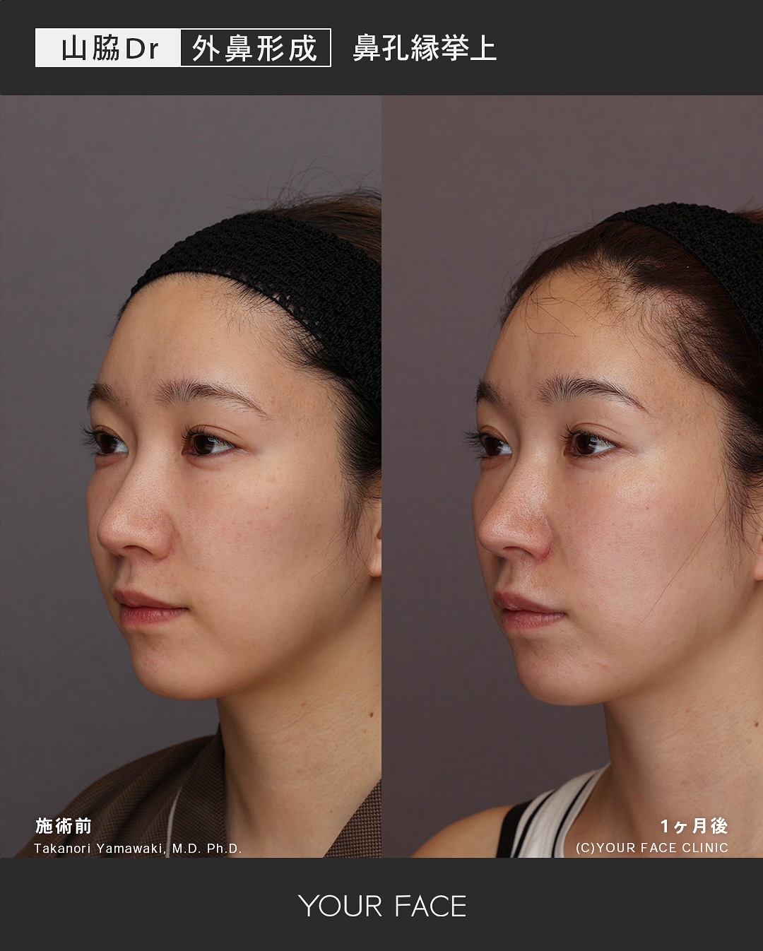 傷は鼻の縁に沿って目立ちにくく、変化は自然。