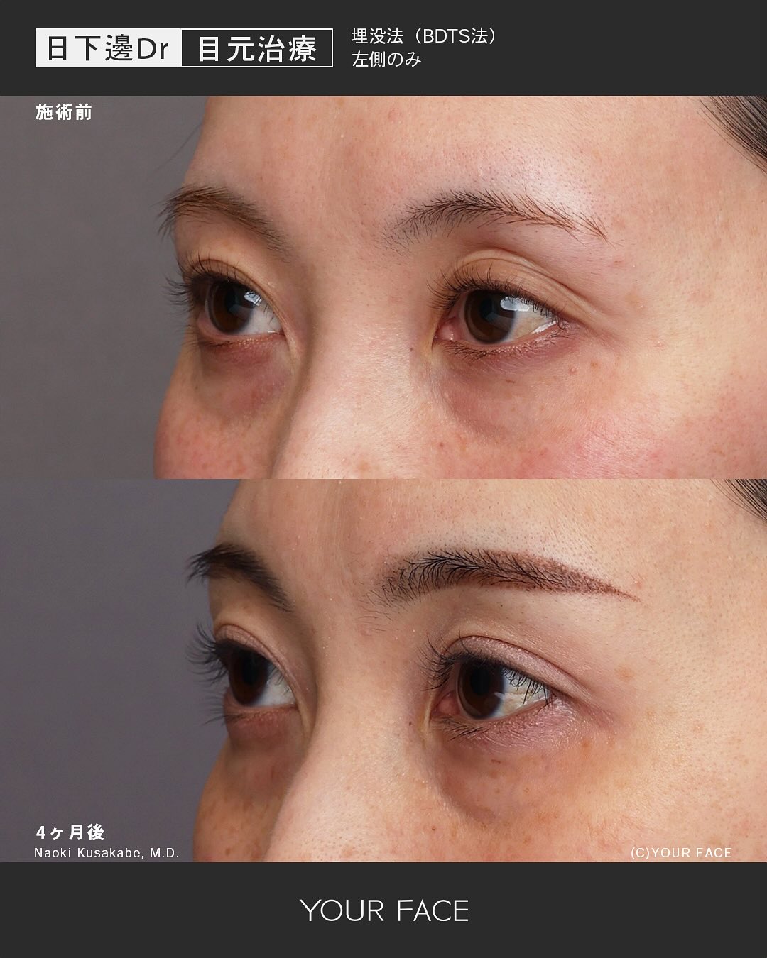 軽度の眼瞼下垂もあり、二重が入らない原因となっている可能性もあるため、根本治療をするなら眼瞼下垂手術で目の開きをよくして二重も作ってあげるのがベストではありますが、シミュレーションで右に合わせちょうどいい幅の二重を作ることができ、くぼみも改善することがわかったので、目の開きはよくならないことをお伝えし埋没を行いました。