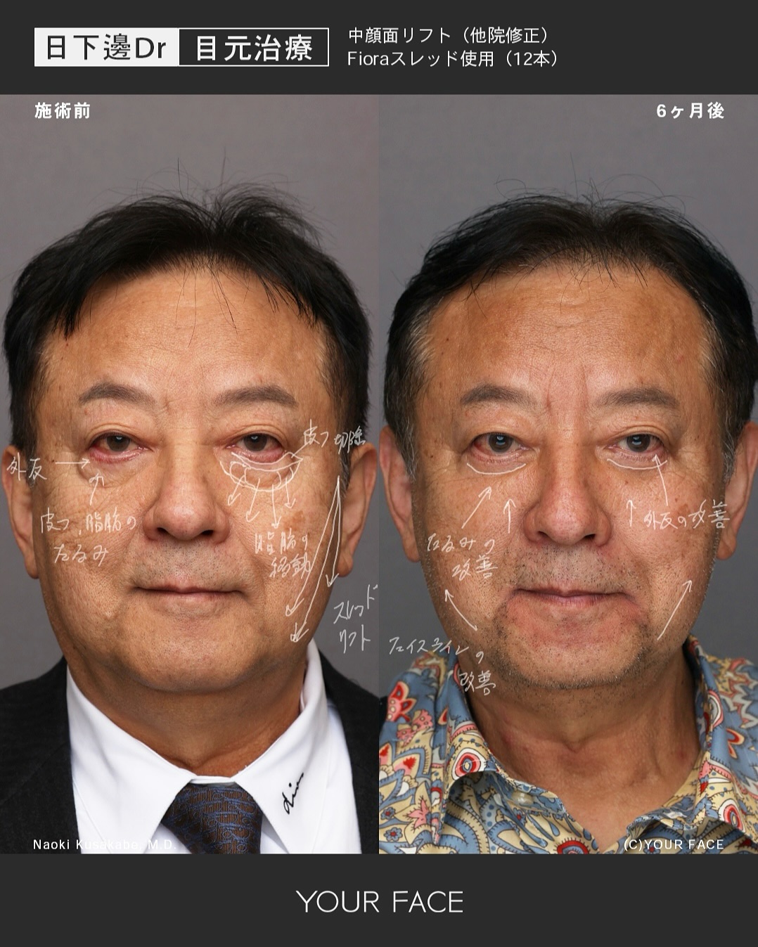 なので前回行われていないリガメントの剥離、眼窩脂肪の移動・固定と、余剰皮膚の切除を行いました。また中顔面リフトにより下垂した頬の脂肪の引き上げを行いました。また、外反の矯正・予防のために下まぶたを引き締める処置を行いました。