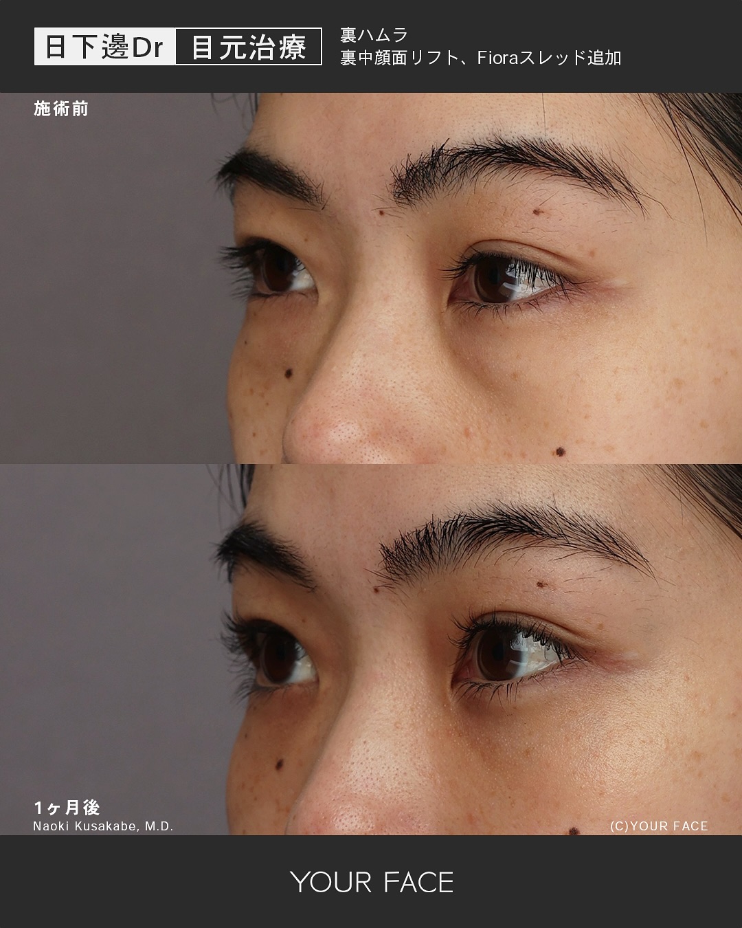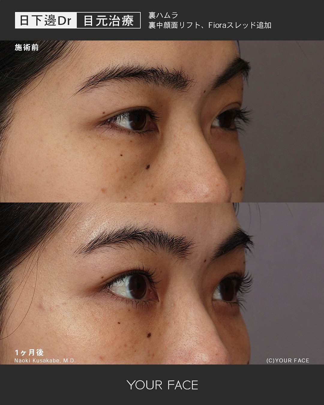 眼窩脂肪の膨らみを移動し靭帯のくぼみを打ち消すと同時に中顔面リフトにより頬の脂肪の移動を行い、よりチークトップの高い丸みのある頬を作っています。