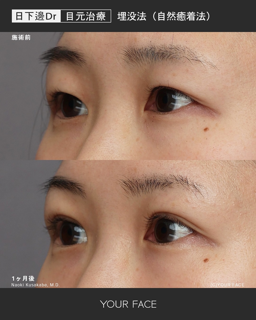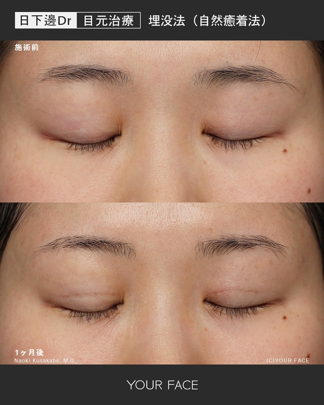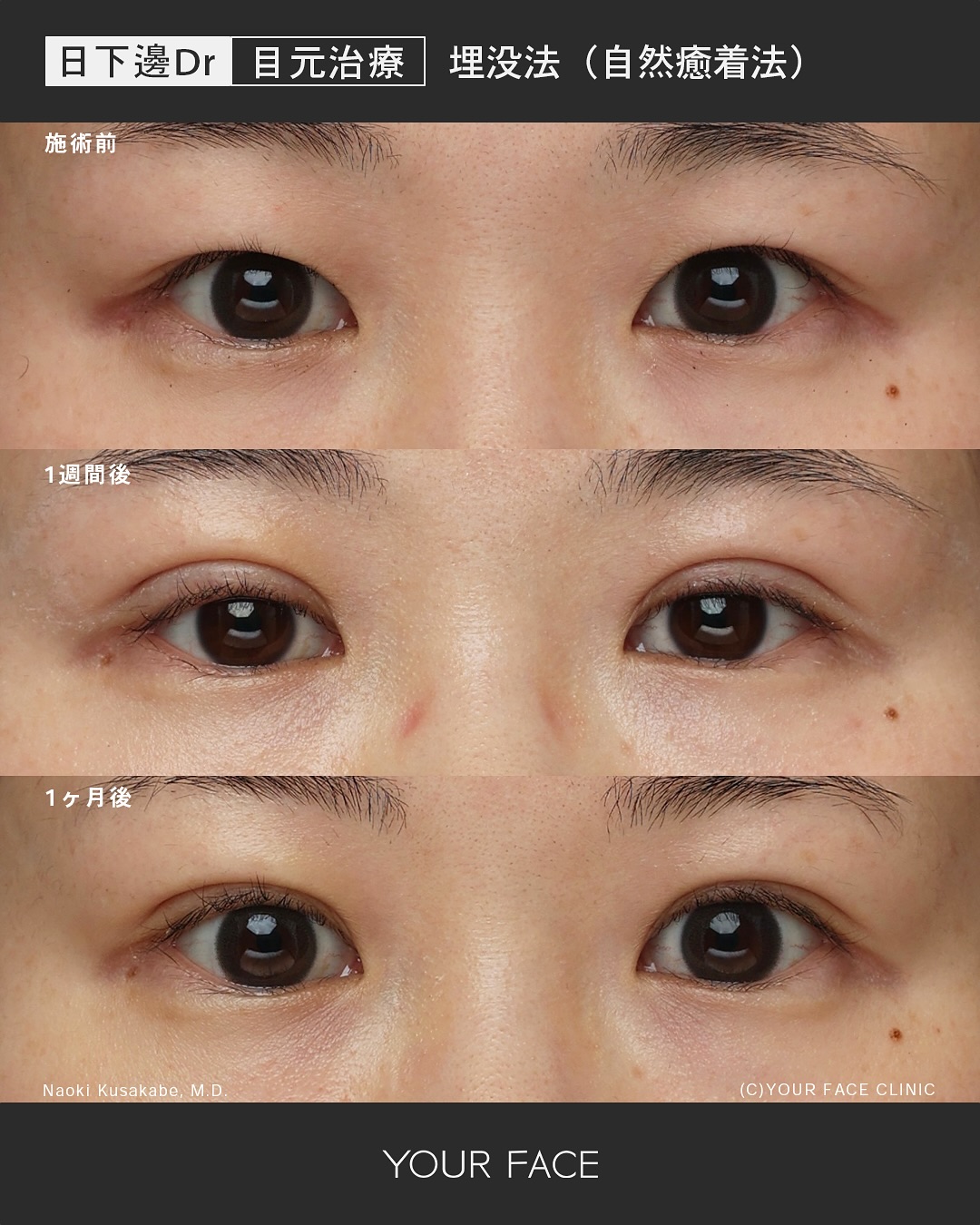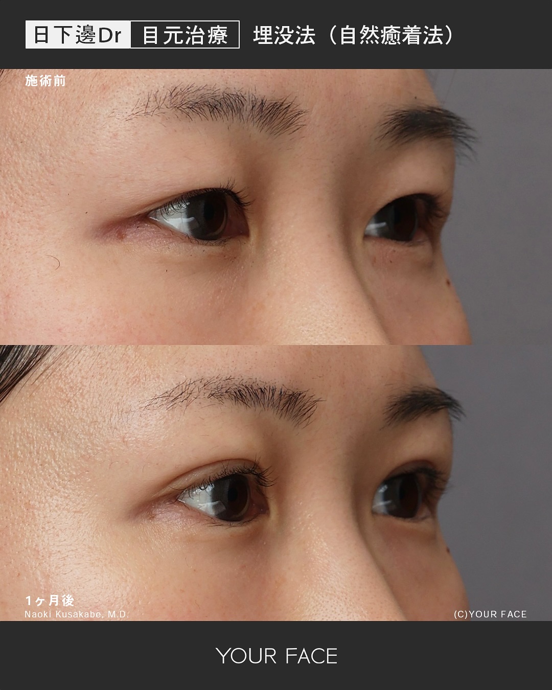 ややまぶたが厚めで埋没が取れやすいタイプのまぶたをされていましたので、ご本人と相談しより取れにくく持続力の高い自然癒着法での施術を行う方針としました。