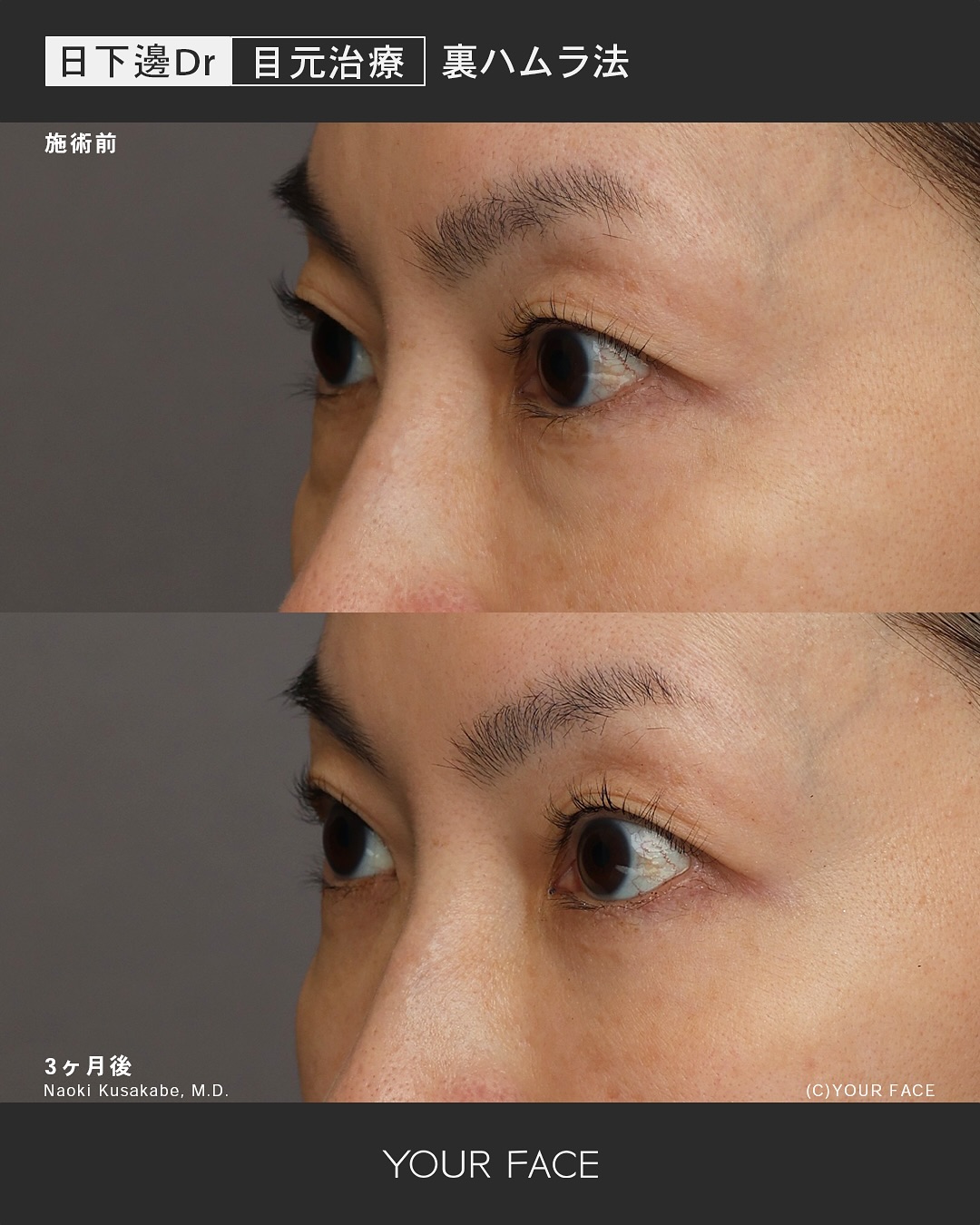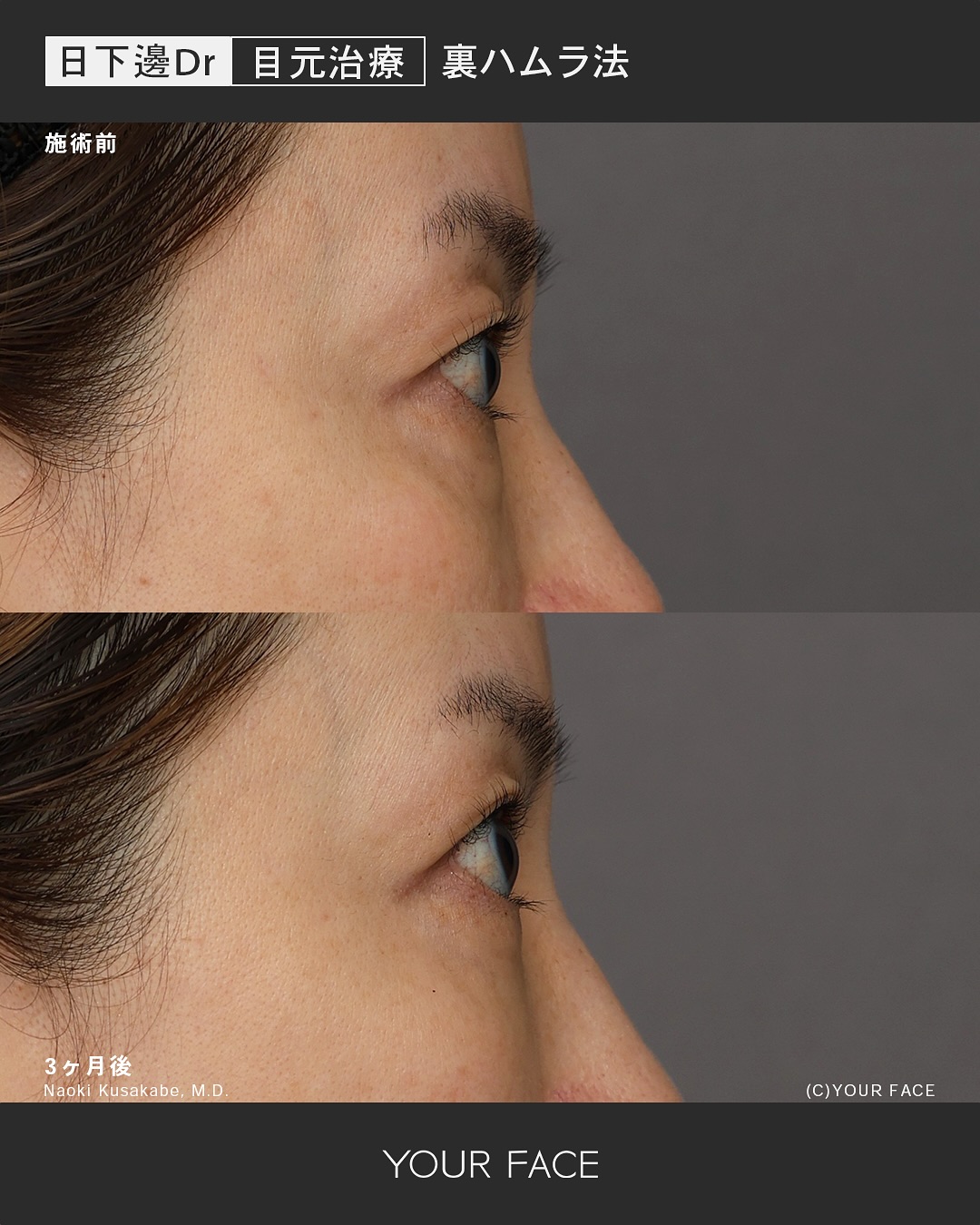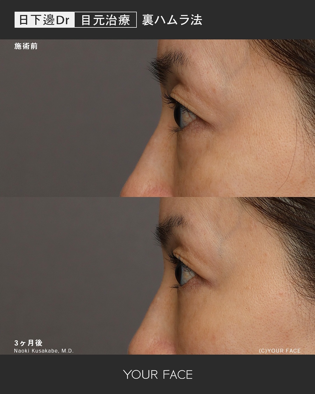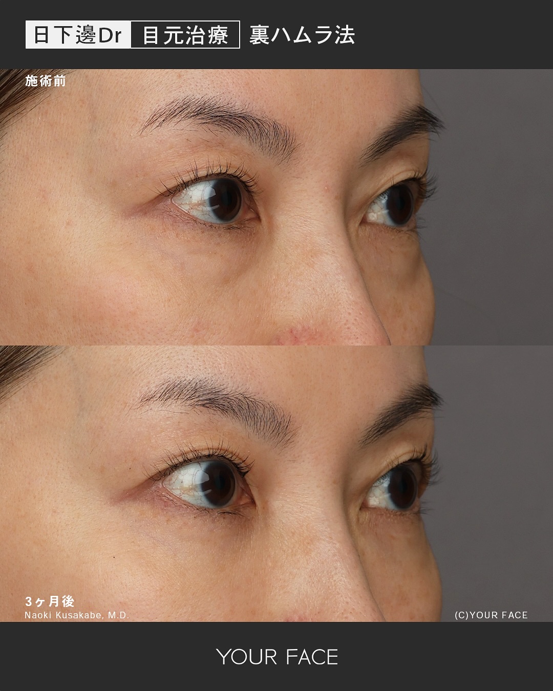 術後3ヶ月の経過になります。膨らみやくぼみによる影クマはなくなり滑らかで綺麗な下まぶたになりました。