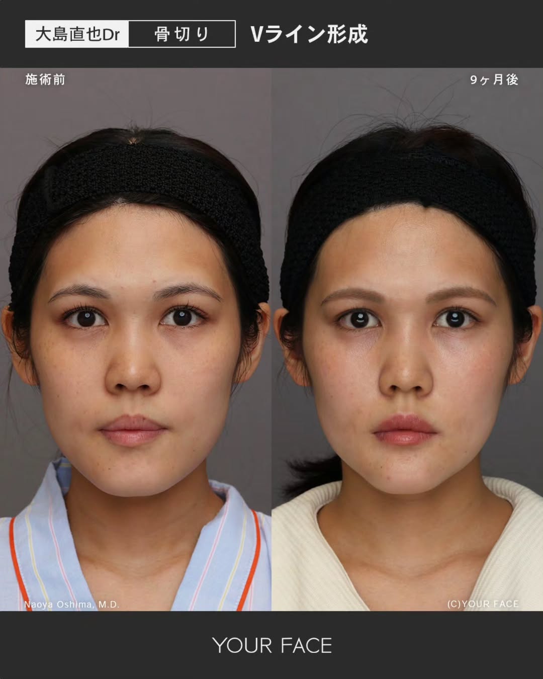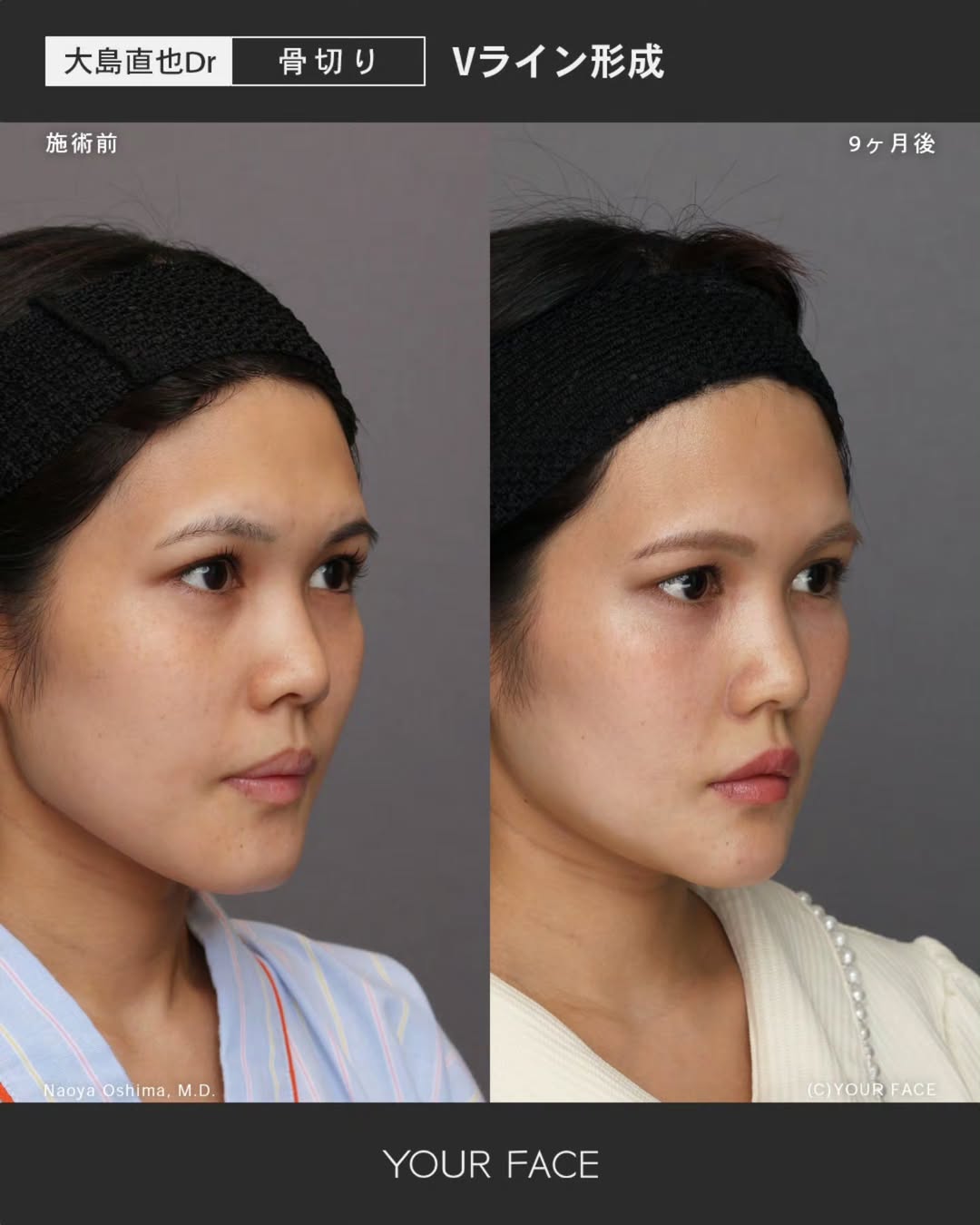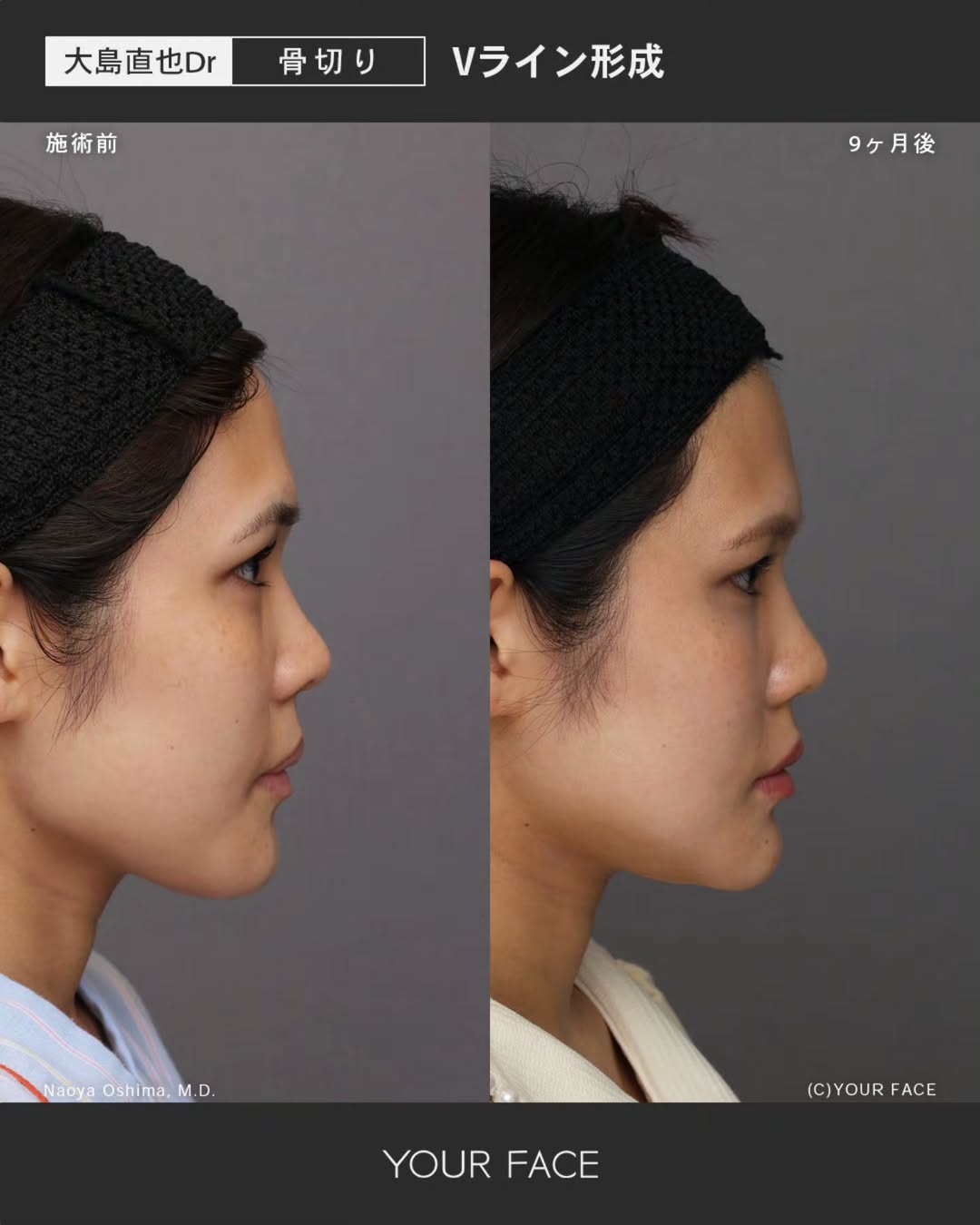他の主訴として中顔面の陥没感、軽度の下顎前突感もありましたが、ご相談の結果、両顎手術は行わずVライン形成を行いました。